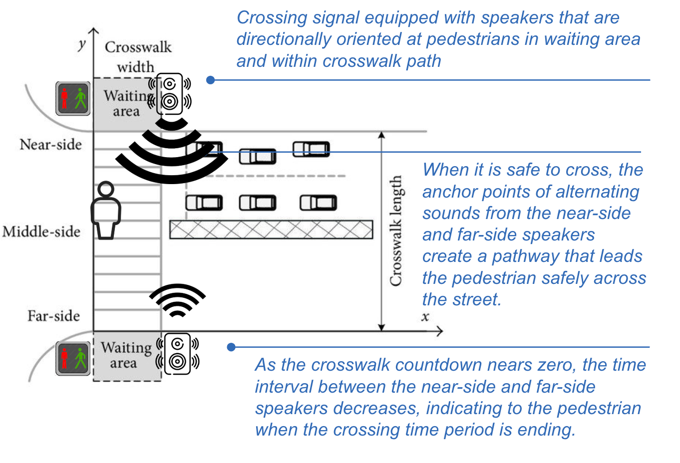 - When the crosswalk sign indicates that it is safe to cross, the speakers will alternate beeping sounds, creating an auditory pathway that guides pedestrians across the street. This bi-directional alternating signal turns sound into valuable navigation information.